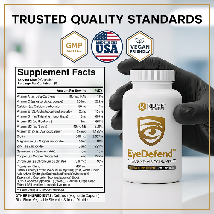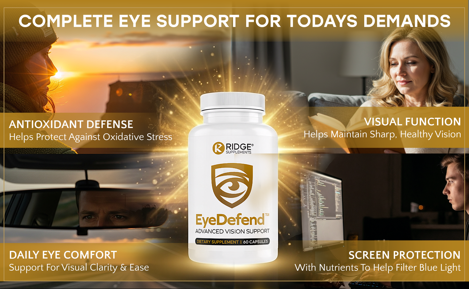 EyeDefend Advanced Vision Support is a premium eye health formula designed for both short-term comfort and long-term protection. With a blend of lutein, zeaxanthin, vitamins, minerals, and botanicals like bilberry, eyebright, and grape seed extract, it helps support relief from occasional screen-related strain while building lasting macular and retinal health. Antioxidants such as Vitamin C, Vitamin E, and Alpha Lipoic Acid defend against oxidative stress, while key nutrients like Vitamin A, Zinc, and Selenium promote visual clarity and performance. Made in the USA and quality tested for purity and potency, EyeDefend is your daily support for comfort today and healthy vision for the future